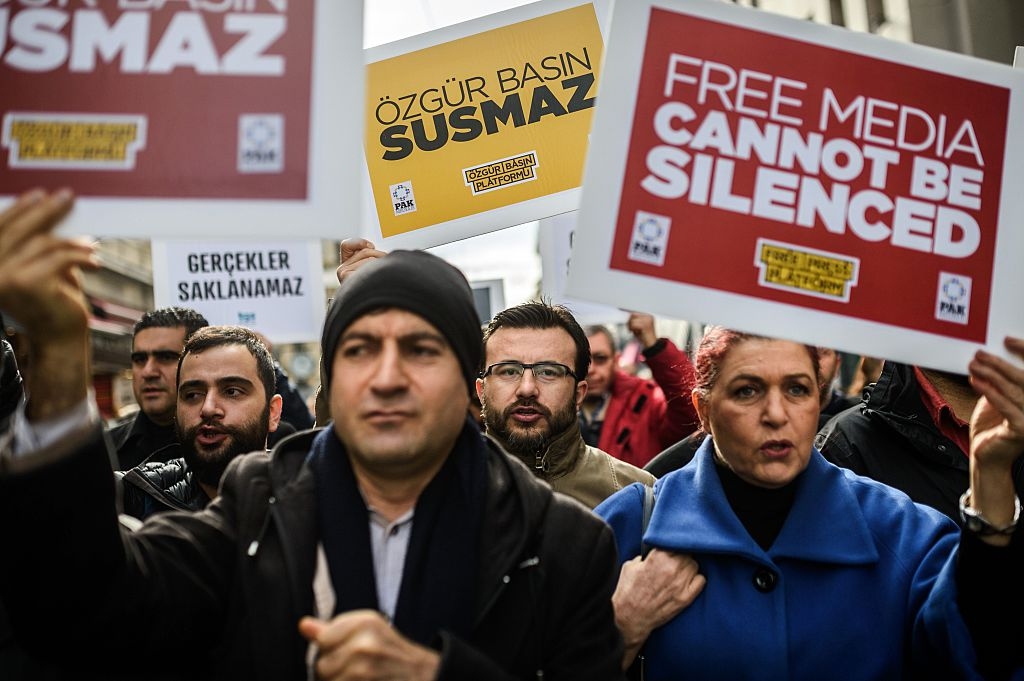 The ways through which the Turkish state silences dissent are typical of the unfree world. According to the left-wing Birgün newspaper, 5,223 people stood trial on the charge of "insulting the president" in 2018, with journalists often being singled out. Pictured: A protest in Istanbul against the imprisonment of journalists in Turkey, on January 10, 2016. (Photo by Ozan Kose/AFP via Getty Images)
