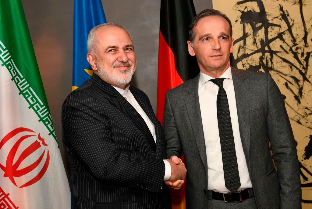German Foreign Minister Heiko Maas (right) shakes hands with Iran's Foreign Minister Mohammad Javad Zarif in Munich on February 15, 2020. (Photo by Thomas Kienzle/POOL/AFP via Getty Images)