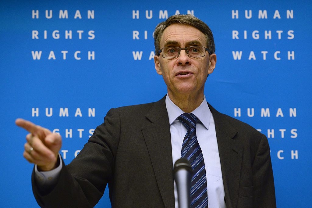 Hamas, the Palestinian terrorist group dedicated to the destruction of Israel, is so pleased with Human Rights Watch (HRW) that this week it issued a statement praising the organization for its systematic and continuous bashing of Israel. Pictured: Kenneth Roth, executive director of Human Rights Watch, speaks at a press conference on January 21, 2014 in Berlin. (Photo by John MacDougall/AFP via Getty Images)
