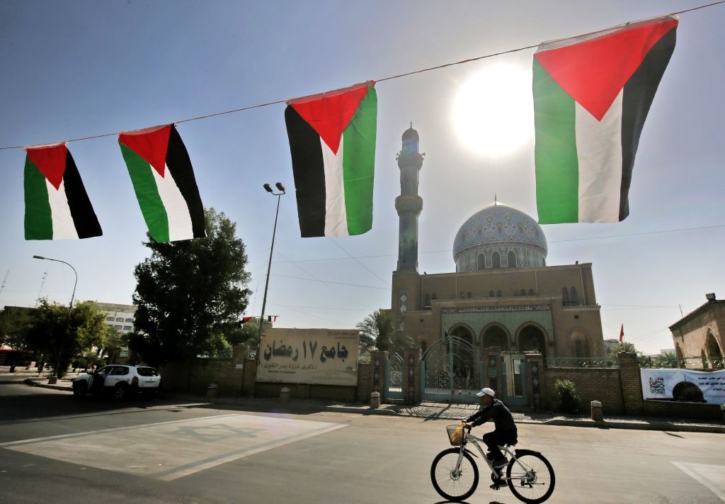 Iraqis' contempt for Palestinians reached its peak last month during Al-Quds Day ("Jerusalem Day") celebrations in Baghdad. Many Iraqis were unhappy with the event, often used to express Arab and Islamic solidarity with the Palestinians. Pictured: A man rides a bicycle under Palestinian flags in the Iraqi capital Baghdad on May 22, 2020, hung for the celebrations marking Al-Quds Day. (Photo by Ahmad Al-Rubaye/AFP via Getty Images)