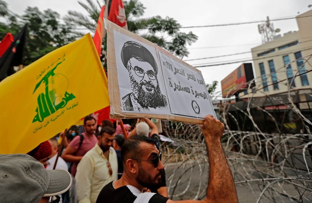 The Iranian-backed terrorist group Hezbollah has long functioned as a state-within-a-state in Lebanon and its leader, Hassan Nasrallah, is the de facto ruler of the country. Now that he is having trouble paying salaries to his terrorists, Nasrallah hopes that the US will rescue Lebanon (and Hezbollah) from collapse. Pictured: Lebanese supporters of Hezbollah, carrying the flag of the group and a portrait of Nasrallah, at an anti-American demonstration near the US Embassy in Awkar, northeast of Beirut, on July 10, 2020. (Photo by Joseph Eid/AFP via Getty Images)