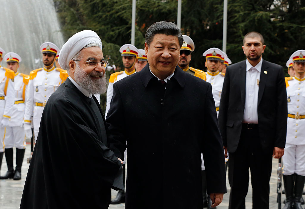 The prospect of a new Iran-China military alliance taking shape in the Indian Ocean is a development that will be taken with the utmost seriousness by the U.S. military, which is already concerned about Iran's attempts to spread its influence throughout the region. Pictured: Iranian President Hassan Rouhani shakes hands with Chinese President Xi Jinping on January 23, 2016 in Tehran. (Photo by STR/AFP via Getty Images)