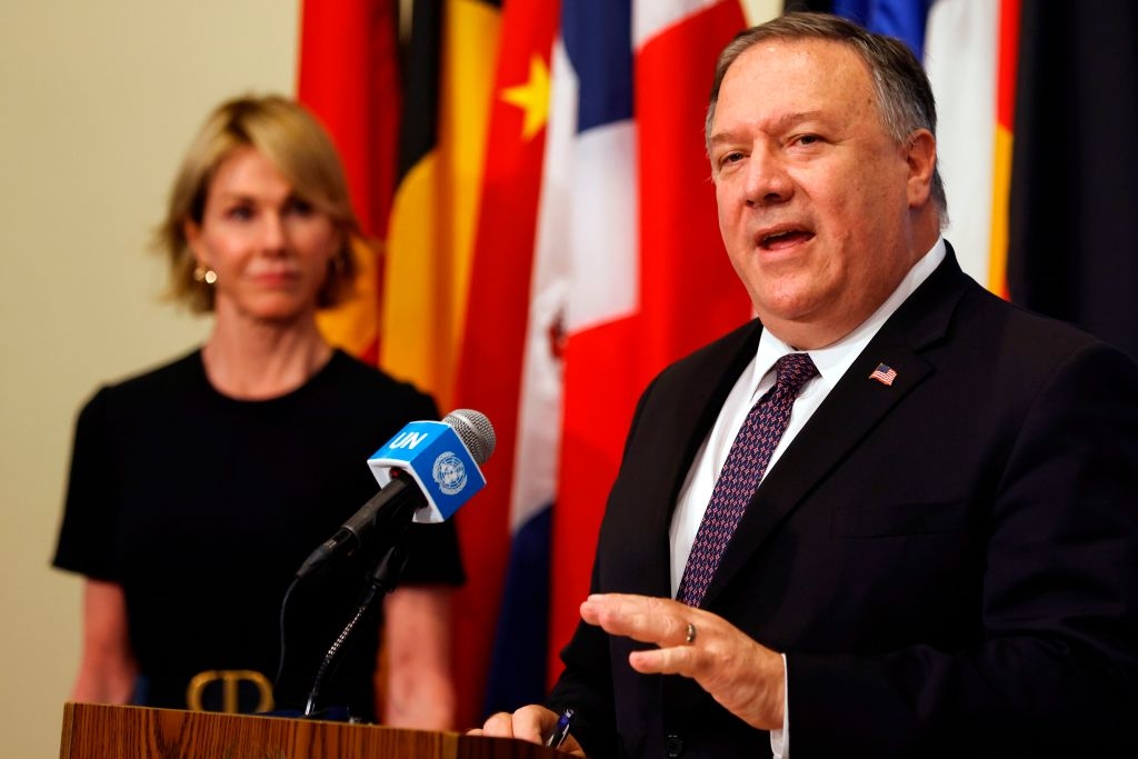 On August 14, the United Nations Security Council voted to permit the 13-year arms embargo on Iran, "the world's worst state sponsor of terrorism," to expire. Pictured: US Secretary of State Mike Pompeo, flanked by US Ambassador to the UN Kelly Craft, speaks after meeting with UN Security Council members about the restoration of sanctions against Iran, on August 20, 2020. (Photo by Mike Segar/Pool/AFP via Getty Images)