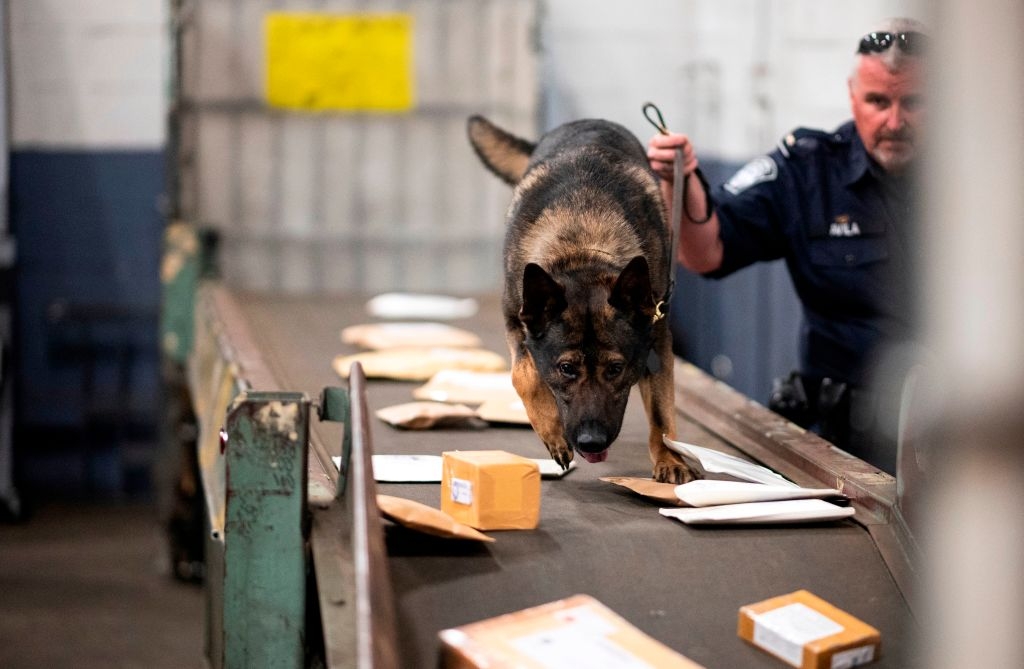Fentanyl is often sent to the U.S. by mail, which means the Chinese state, through the National Postal Service of China, is the distributor. U.S. Customs and Border Protection learned that 13% of packages from China contain some form of contraband, including fentanyl and other deadly substances. Pictured: An officer from Customs and Border Protection works with a dog to check parcels at John F. Kennedy Airport's US Postal Service facility on June 24, 2019 in New York. (Photo by Johannes Eisele/AFP via Getty Images)