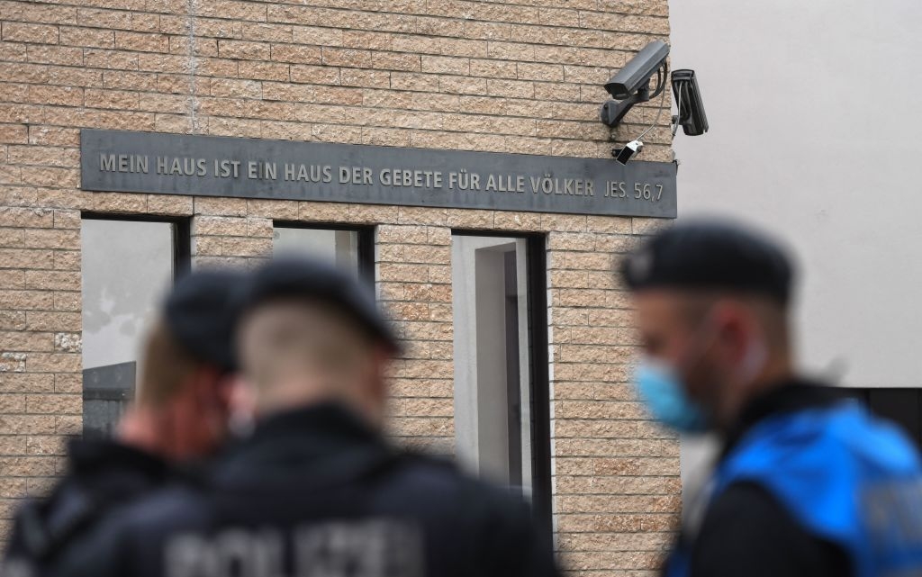 On May 13, a highly aggressive group of at least 200 people brandishing Palestinian and Turkish flags and shouting anti-Semitic slurs gathered in front of a synagogue in Gelsenkirchen, Germany. Police were deployed to prevent the mob from entering the building. Pictured: Policemen guard the Gelsenkirchen synagogue during a vigil of the Initiative against Anti-Semitism Gelsenkirchen on May 14, 2021. (Photo by Ina Fassbender/AFP via Getty Images)