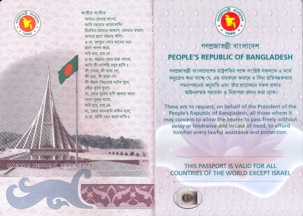 Recently, the government of Bangladesh dropped the infamous phrase "this passport is valid for all countries of the world except Israel" from its new passports. Now it has become a national issue of debate. (Image source: Tusharkb2) Recently, the government of Bangladesh dropped the infamous phrase "this passport is valid for all countries of the world except Israel" from its new passports. Those words had been prominently inscribed since the country's independence from Pakistan in 1971. Six months ago, when Bangladeshi government introduced a new machine-readable passport with an electronic chip, the "except Israel" clause was quietly erased with no public announcement. The change was, in a sense, classified. In early May, a man went to the passport department headquarters to collect the passports of his mother and brother, when he noticed that the clause had been omitted. Through social media, the news went viral. Now it has become a national issue of debate. Continue Reading Article |