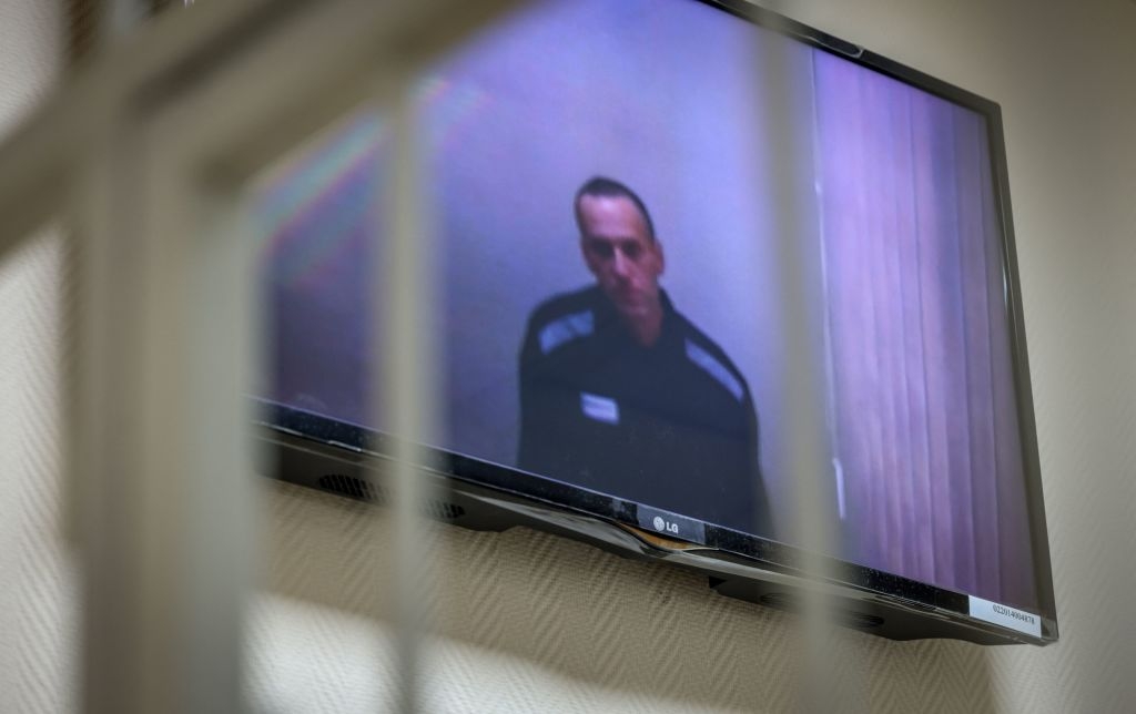 Pictured: Russian opposition leader Alexei Navalny appears on screen via a video link from prison, during a court hearing in the town of Petushki, Russia, on May 26, 2021. (Photo by Dimitar Dilkoff/AFP via Getty Images)