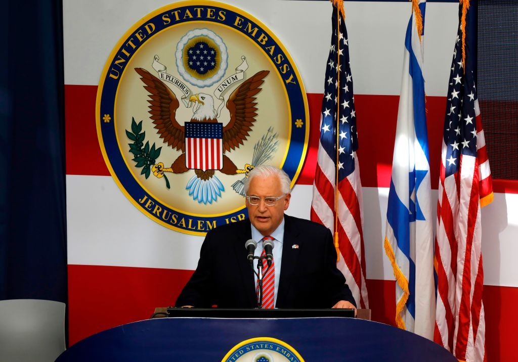 US President Joe Biden plans to open a consulate in Jerusalem. This amounts to a de facto US embassy to the Palestinians on Israeli territory. Its true purpose is to undermine Israeli sovereignty in its own capital city. Pictured: David Friedman, then US Ambassador to Israel under the Trump Administration, delivers a speech during the opening of the US embassy in Jerusalem on May 14, 2018. (Photo credit should read Menahem Kahana/AFP via Getty Images)