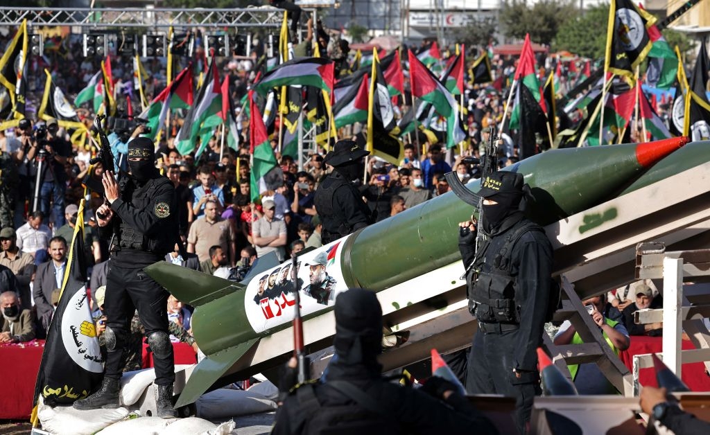 The Iran-backed Palestinian Islamic Jihad (PIJ), the second largest and hugely influential group in the Gaza Strip after Hamas, does not believe that the conflict with Israel is over Jerusalem, settlements, borders, checkpoints or Palestinian prisoners. For PIJ, the only way for solving the conflict is by eliminating Israel and killing as many Jews as possible. PIJ sees Israel as one big settlement and a foreign implant that needs to be dismantled as soon as possible. Pictured: Palestinian Islamic Jihad terrorists parade with Bader 3 rockets in Gaza City, on May 29, 2021. (Photo by Thomas Coex/AFP via Getty Images)